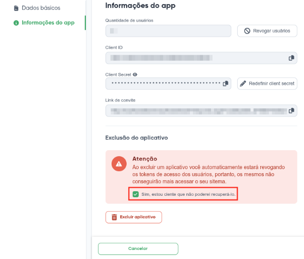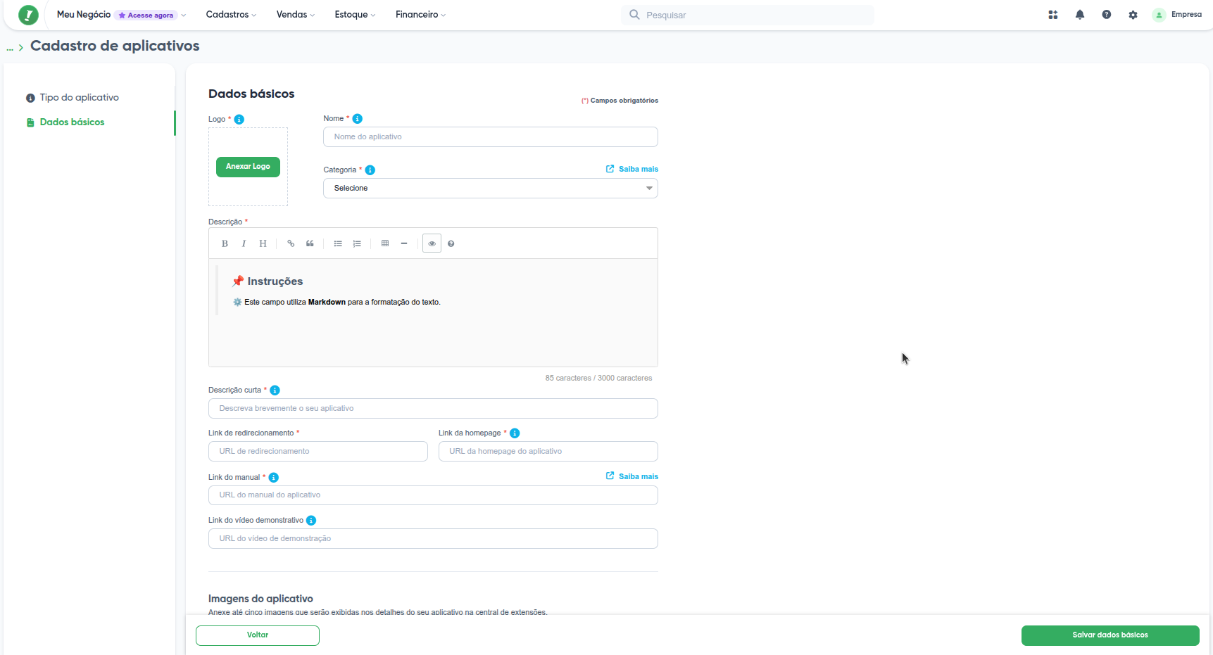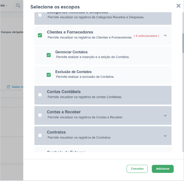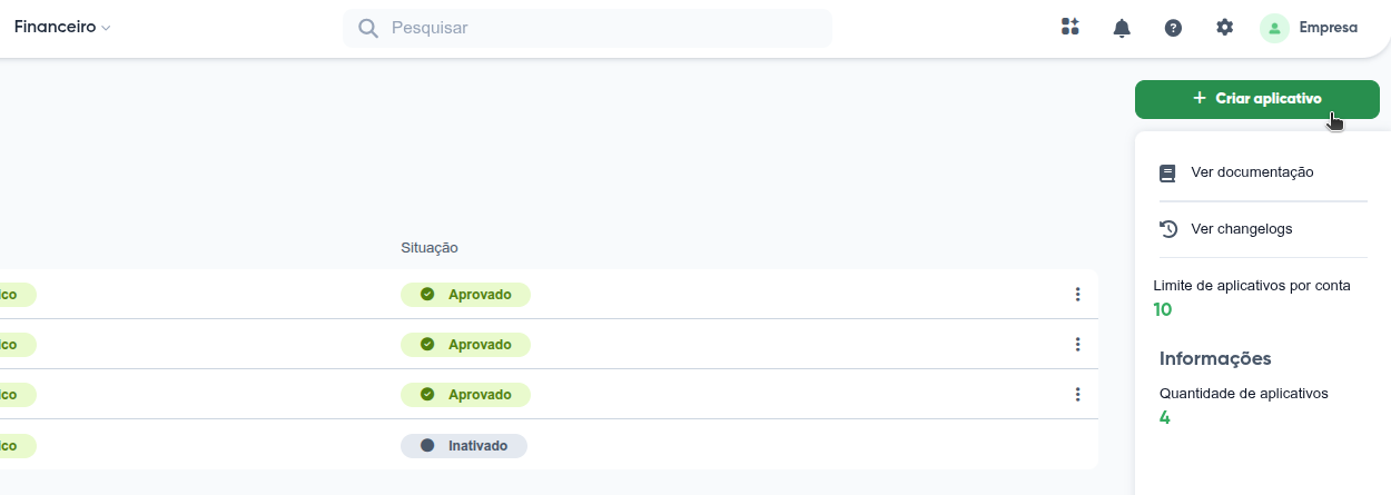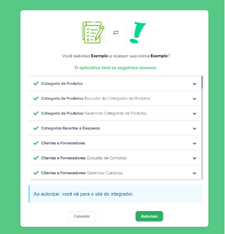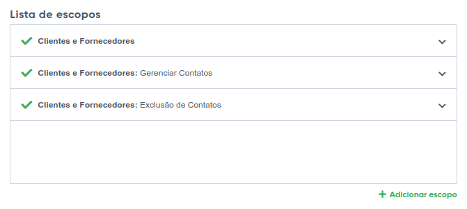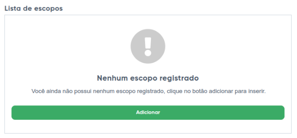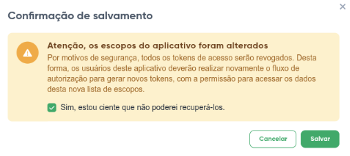Após o preenchimento dos dados, clique no botão Salvar para finalizar a criação do aplicativo. O botão será habilitado somente após a inserção de um escopo.CategoriasAs categorias são utilizadas para facilitar o cliente na busca por um aplicativo, sendo elas:NomeDescriçãoImagens do aplicativoUtilizadas somente em aplicativos públicos.As imagens do aplicativo são exibidas na tela de contratação do aplicativo e podem ser usadas como uma forma de divulgar as funcionalidades presentes no sistema. É permitido realizar o upload de até cinco imagens.Exemplo de aplicativo com imagens:EscoposO Escopo é a representação da permissão para operar sobre os recursos do usuário. Portanto, informe somente os escopos necessários, passando maior clareza e segurança ao usuário no momento da autorização do aplicativo.Para inserir os escopos clique no botão Adicionar, conforme ilustrado na imagem a seguir.Marque os escopos que serão utilizados pelo aplicativo e clique no botão Adicionar. Caso seja necessário, é possível filtrar os escopos por módulo e nome, usando a busca localizada no topo desta janela.Os escopos escolhidos serão listados no formulário. Para excluir um escopo, passe o cursor sobre a linha desejada e clique no ícone da lixeira, uma janela pedindo a confirmação da exclusão será exibida.Se precisar inserir novos escopos, clique na ação de Adicionar escopo logo abaixo da listagem.É importante lembrar que o aplicativo só terá acesso aos dados referentes aos escopos selecionados. Qualquer adição ou exclusão de escopos só será confirmada após o salvamento do aplicativo. Se isso acontecer, uma janela de confirmação será exibida.Ao confirmar a edição, todos os usuários do aplicativo serão automaticamente revogados. Desta forma, é garantida a segurança das informações dos usuários, exibindo a nova listagem de escopos no momento da autorização.Modelo de manual