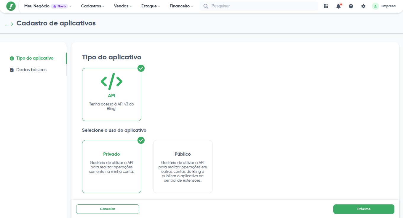AplicativosIntroduçãoEste manual contempla o passo a passo aos integradores que desejam criar um aplicativo e entender o funcionamento do fluxo de autorização para a obtenção dos tokens de acesso do OAuth 2.0.InscriçãoCaso você ainda não possua uma conta no Bling clique aqui e faça a sua inscrição.Acesso ao móduloÉ possível cadastrar um aplicativo pela conta do administrador ou criando um usuário para tal finalidade. Recomendamos a criação de um usuário para cada desenvolvedor, dessa forma, cada usuário poderá gerenciar somente os seus aplicativos.