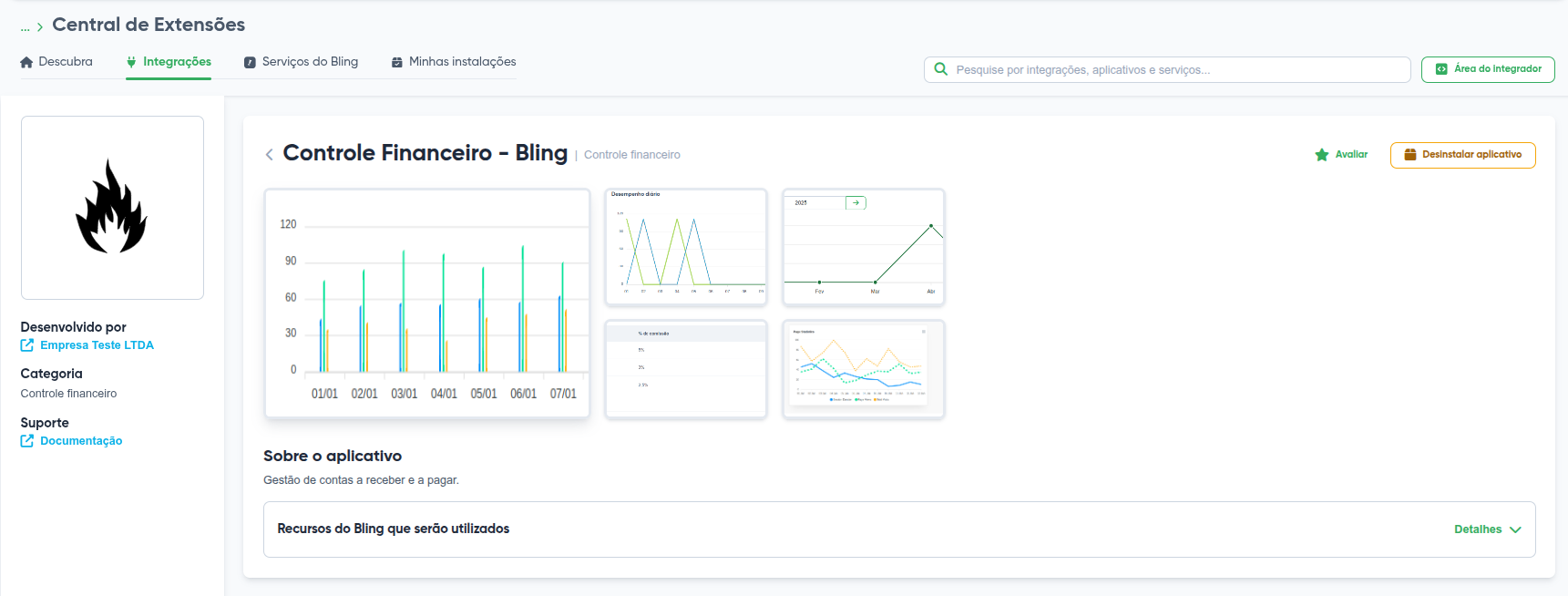 Neste menu é possível buscar na barra de pesquisa o aplicativo XXXXX.Ao localizar o aplicativo desejado, será possível clicar em Instalar aplicativo.Ao clicar para instalar, é solicitada a autorização:Isso irá autorizar o aplicativo a obter os tokens e se comunicar com sua conta Bling. A partir desse momento, todas as configurações no Bling estão finalizadas.Passos no Integrador (Informações que o desenvolvedor do app deve adicionar no manual)Descreva o fluxo que o cliente precisa seguir em seu site/sistema:REQUISITOS Existe a obrigatoriedade de ter uma conta antes de instalar o aplicativo?