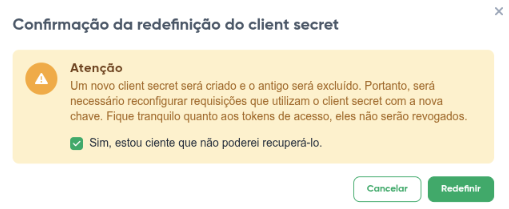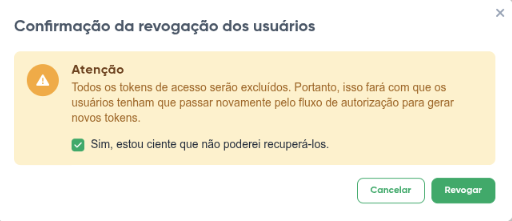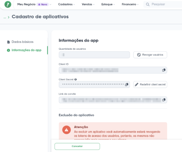 Informações do aplicativoApós a criação do aplicativo, a aba "Informações do app" ficará disponível. Atente-se ao Client Id e ao Client Secret, que serão utilizados no momento da autorização.É possível revogar os usuários do aplicativo. Essa ação exclui todos os tokens de acesso e faz com que os usuários tenham que realizar novamente a etapa de autorização. Ao executar a ação através do botão Revogar usuários, será solicitada a confirmação da ação.Logo abaixo da quantidade de usuários é possível visualizar as credenciais do aplicativo. Para revelar o Client Secret clique no ícone de olho. Assim como qualquer credencial, é importante manter a chave em segredo. Essa credencial será utilizada nas requisições para obtenção de tokens de acesso. O Client Secret poderá ser alterado a qualquer momento clicando no botão Redefinir client secret.Após pressionar o botão Redefinir client secret será solicitada a confirmação da ação. A ação gera um novo Client Secret, portanto será necessário realizar a alteração nas requisições que fazem uso do Client Secret anterior.ExclusãoCom a exclusão do aplicativo, todos os tokens de acesso dos usuários serão automaticamente revogados.Para excluir, na aba "Informações do app", ao confirmar a ciência da ação, o botão Excluir aplicativo será exibido.Códigos de acessoPara gerar os códigos de acesso é necessário que os usuários deem autorização sobre o acesso aos dados das contas, ao aplicativo. O OAuth 2 protocola 4 tipos de concessão para que essa autorização seja realizada, no entanto o Bling fará uso de apenas uma delas, que é o Authorization Code. Portanto, será necessário seguir o fluxo de autorização descrito abaixo para obter os códigos de acesso.TerminologiaTermoDetalhamentoFluxo de autorizaçãoSegue abaixo um resumo das etapas do fluxo de autorização.