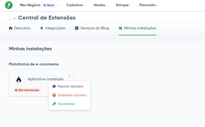 Authorization codeUtilizando redirecionamento de URL o client app direciona o usuário para o endpointauthorize:ParâmetroDescriçãoOs parâmetros redirect_uri e scope são considerados de uso opcional pela RFC, portanto, os mesmos não serão exigidos na requisição. Para estes dois parâmetros sempre serão usados os valores inseridos previamente no cadastro de aplicativos, mesmo que os mesmos sejam utilizados na requisição.URL de exemplo da requisição:Se o usuário autorizar a sua solicitação, o authorization server irá redirecionar o user agent para a URL de redirecionamento do aplicativo. Os parâmetros abaixo são incluídos na URL de redirecionamento:ParâmetroDescriçãoExemplo de URL usada como callback com os parâmetros utilizados no retorno do authorization server:Tokens de acessoCom o authorization_code o client app deve realizar uma requisição POST para o endpoint/token, nisso o code será validado e os tokens de acesso serão retornados. Lembrando que o prazo para realizar esta requisição é de 1 minuto, este é o tempo de expiração do code.Formato da requisição HTTP que deve ser utilizado e uma tabela com o conteúdo que deve ser inserido no body:Parâmetro no bodyDescriçãoO client app precisa ser autenticado para realizar esta operação, portanto, será necessário informar as suas credenciais no cabeçalho da requisição (não é permitida a inserção destes parâmetros no body). Para isso use o esquema “Basic” de autenticação HTTP inserindo um cabeçalho no formato:Lembrando que estas credenciais devem ser o client_id junto do client_secret separados por ":" e codificados em base64. Também é importante utilizar HTTPS / TLS para garantir a segurança dos seus dados.Faça a requisição inteiramente no lado do servidor, busque evitar a exposição de qualquer dado inserido nela, como as credenciais do app ou o authorization_code.Segue um exemplo de requisição dos tokens de acesso utilizando cURL:Caso a requisição seja válida, será retornado um objeto JSON contendo o access_token, com o seu tipo, tempo de expiração, escopos permitidos e o refresh_token. Veja abaixo um exemplo desse retorno e um quadro com a explicação de cada parâmetro.Parâmetro da respostaDescriçãoRefresh TokenQuando o tempo do access_token terminar é possível requisitar um novo utilizando o refresh_token, o qual foi enviado junto do access_token e possui um tempo de expiração superior, de 30 dias. Para isso é realizada uma requisição POST para o endpointtoken, na mesma estrutura da requisição apresentada anteriormente, a única diferença está nos parâmetros que devem ser apresentados no body. Veja abaixo o formato da requisição HTTP que deve ser utilizado e a tabela com o conteúdo que deve ser inserido no body.Parâmetros no bodyDescriçãoO retorno desta requisição é o mesmo JSON retornado na requisição do access_token com uso do authorization_code.Utilizando o access tokenCom o access_token é possível realizar requisições para a API do Bling e, assim, acessar os recursos do usuário. Lembrando que este tipo de autenticação só está disponível pela API v3 e só será possível requisitar os dados dos escopos que foram permitidos pelo usuário.Como informado no JSON de retorno dos tokens de acesso, o tipo do token fornecido é o Bearer, portanto, utilize o esquema "Bearer" de autenticação HTTP, inserindo a chave de acesso no cabeçalho da requisição, conforme exemplo:Exemplo de uma requisição cURL para a API de contatos:Revogando o access tokenÉ possível revogar um access_token ou refresh_token para impedir que um usuário ou uma empresa continuem acessando a API. Essa funcionalidade garante que apenas os tokens desejados sejam invalidados.Para revogar um token, o client app deve realizar uma requisição POST para o endpoint/oauth/revoke, utilizando o esquema "Basic" de autenticação HTTP para fornecer suas credenciais, conforme exemplo:Parâmetros no bodyDescriçãoSe essa requisição for bem-sucedida, o token informado será revogado, impedindo seu uso para novas requisições na API.Revogação avançadaPara atender a necessidade de remoção de todos os tokens associados a um usuário ou empresa, foram adicionados os parâmetros revoke_action e revoke_target, que ampliam o escopo da revogação.Parâmetro no bodyDescriçãoMinhas InstalaçõesGerenciamentoAtravés da aba Minhas instalações da Central de Extensões é possível gerenciar os aplicativos que foram autorizados a operar a conta.Ao clicar sobre o menu de contexto de uma instalação, será possível reportá-lo, desinstalá-lo ou reautenticá-lo, caso os códigos de acesso tenham expirados e seja preciso autorizar o aplicativo novamente.
