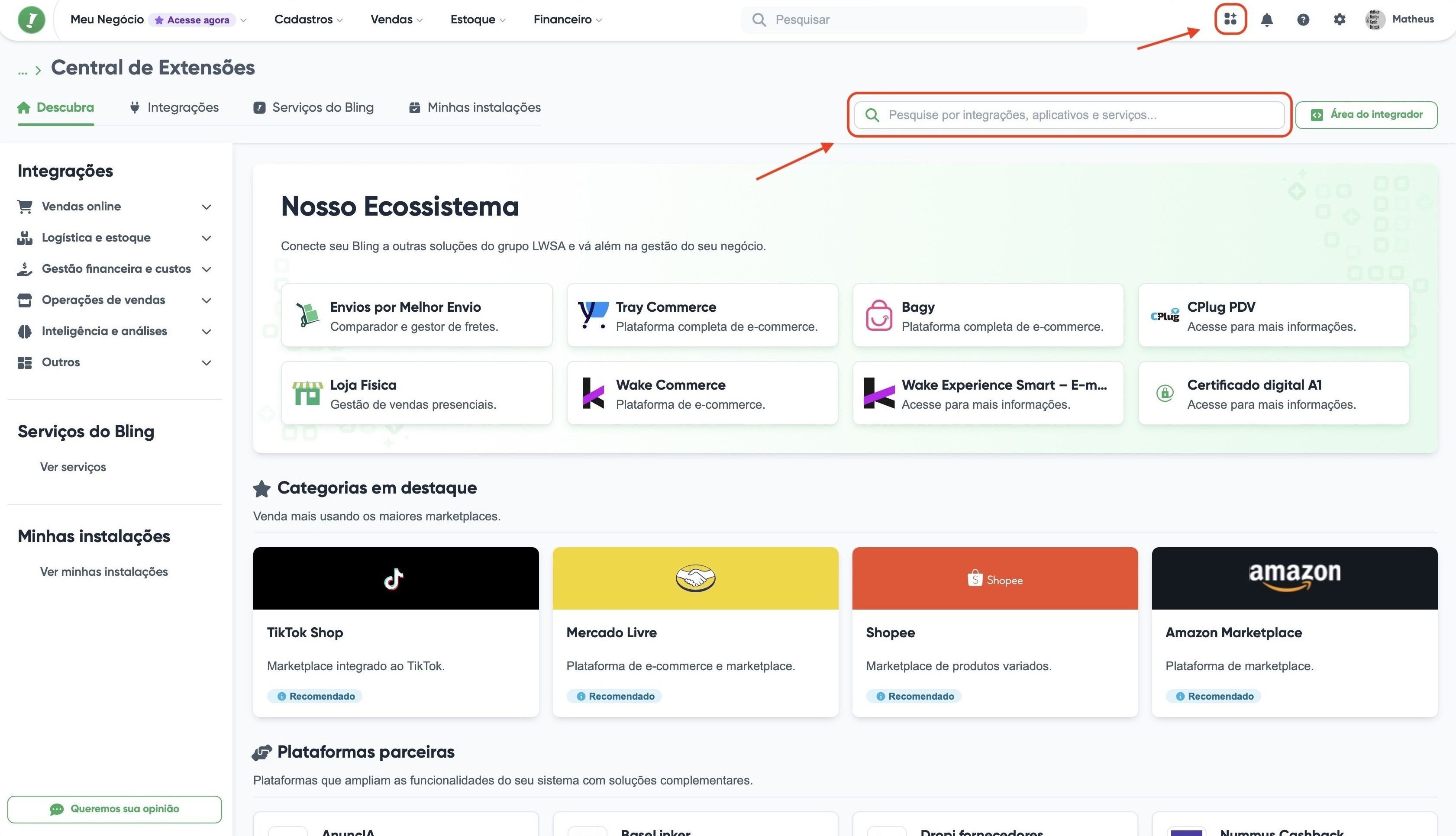 Ex: Para integrar com o Bling, antes de permitir a integração, deve ser acessado a tela de “gerir conta” e clicar em “Integrar com o Bling”