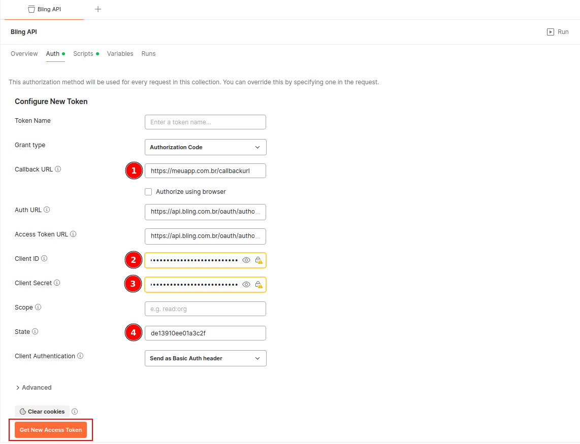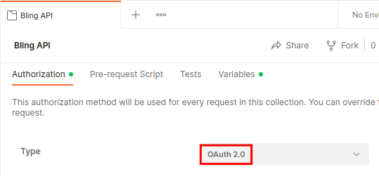 Para isso, clique no nome da collection criada (Bling API) e escolha a aba Authorization.
