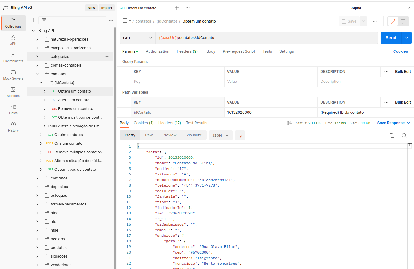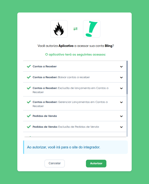 Agora você terá acesso aos escopos da conta Bling que o aplicativo configurado possui.Exemplo de requisiçãoExemplo de requisição GET de Contatos.