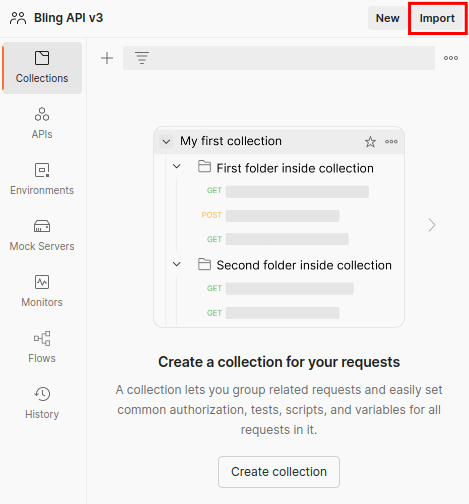 Como testarAPI v3 no PostmanComo pré-requisito para utilização da API v3, é necessário que haja um aplicativo já cadastrado. Caso não o tenha, confira o passo a passo para realizar o cadastro.Importação da collectionÉ possível importar toda a collection da API v3 para o Postman. Esse processo facilita a utilização da API, pois todos os endpoints disponíveis ficam de fácil acesso.Bling collectionNo Postman, clique em Import, selecione o arquivo anteriormente salvo na máquina e importe-o.Configurando a permissão de acessoNesse momento, será necessário configurar as permissões de acesso do aplicativo a conta Bling.