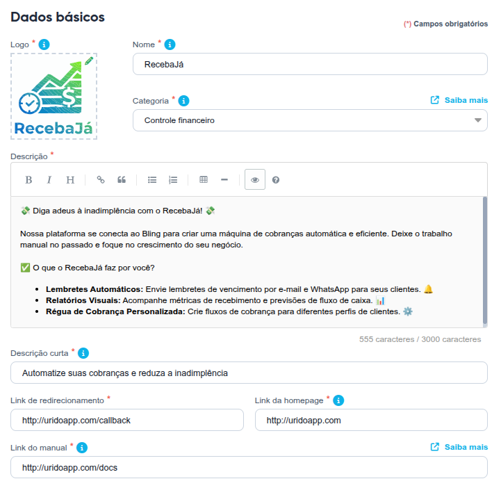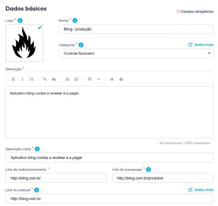 Nome do aplicativo: Nome que será exibido para os clientes do Bling. -