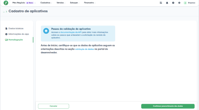 Inativado: Caso sejam identificados ou reportados abusos, o aplicativo poderá ser inativado. Será notificado o problema encontrado e o aplicativo terá todos os tokens de acesso revogados. Para poder reativar o seu aplicativo, será necessário entrar em contato com a nossa equipe.
