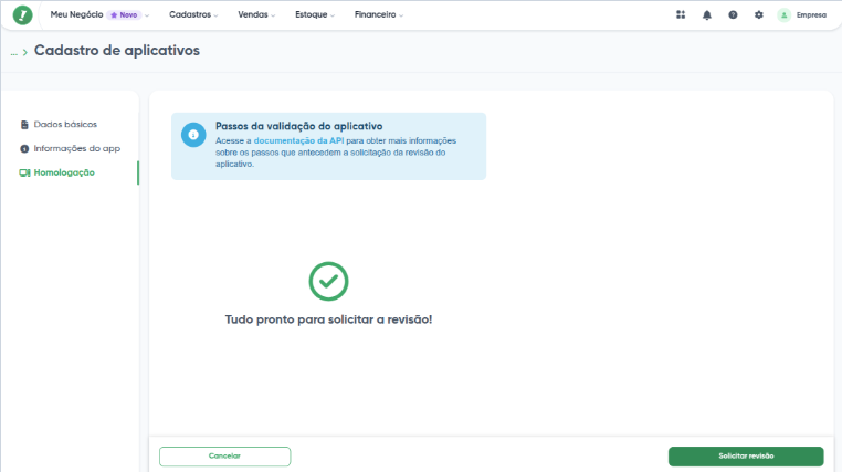 Em revisão: Após o aplicativo estar desenvolvido e pronto para operar contas do Bling, na edição do aplicativo clique em "Solicitar revisão". Após, nossa equipe técnica fará a revisão. -